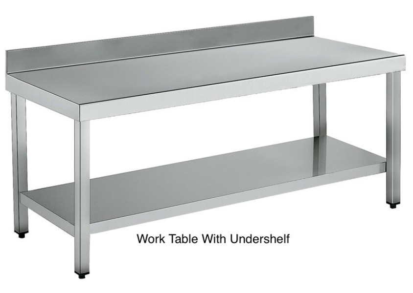 A worktable with an undershelf offers both working space and storage in one unit. The top surface is used for active tasks, while the lower shelf helps store frequently used items. This arrangement keeps the workspace clean and reduces unnecessary movement across the kitchen.